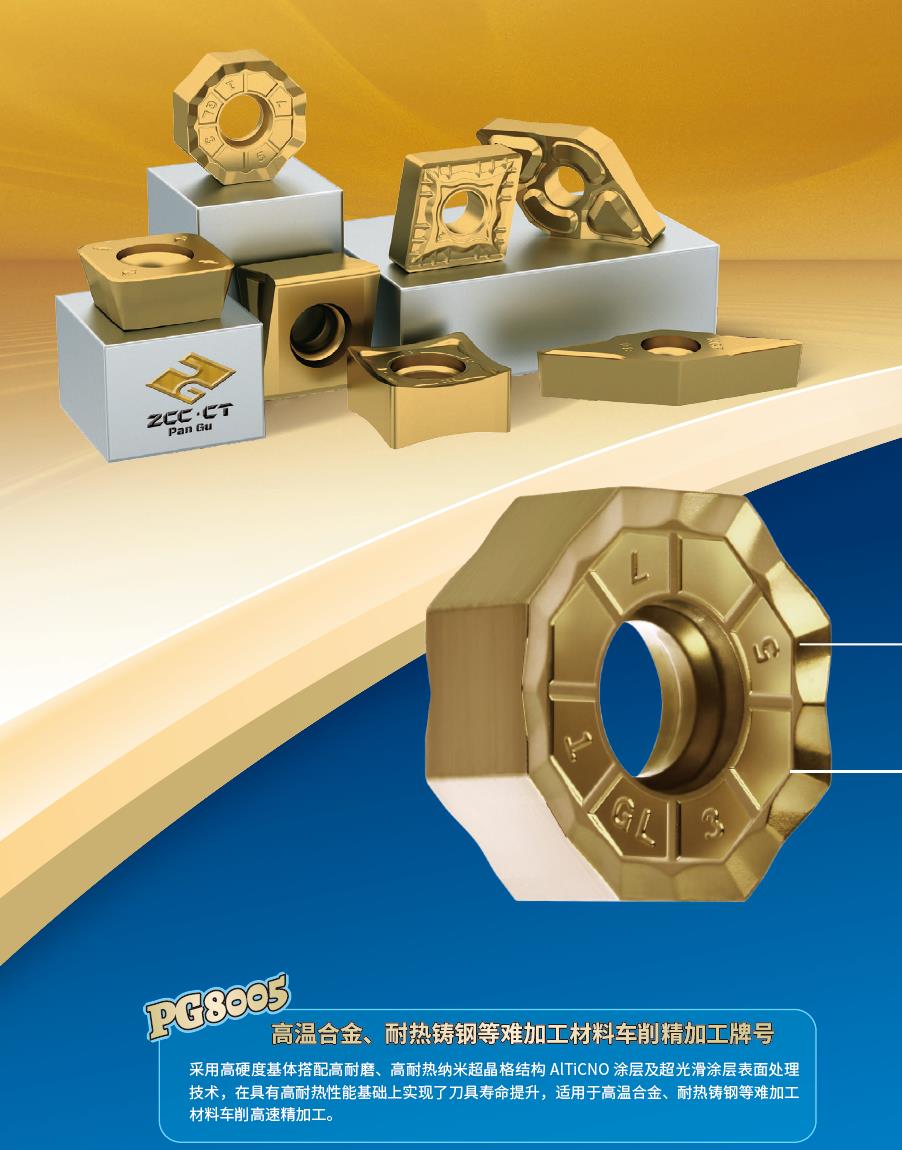 適合難加工材料高效加工的PG8系列數控刀片牌號:PG8系列牌號采用高硬度基體搭配高耐磨、高耐熱納米超晶格結構涂層以及超光滑涂層表面處理技術,適用于高溫合金、耐熱鑄鋼等難加工材料。PG8005搭配NGF,SNR車削槽型分別用于難加工材料的高效車削精加工。PG8020、8030搭配FMA12、EMP09、FMP17等銑削刀具用于難加工材料的面銑、方肩銑以及仿型銑等加工。